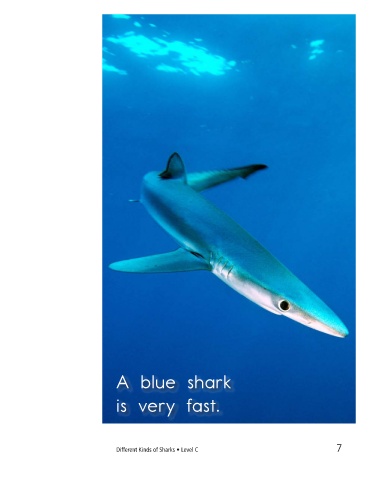 An angel shark has wide fins. A blue shark is very fast. Different Kinds of Sharks • Level C 7 8