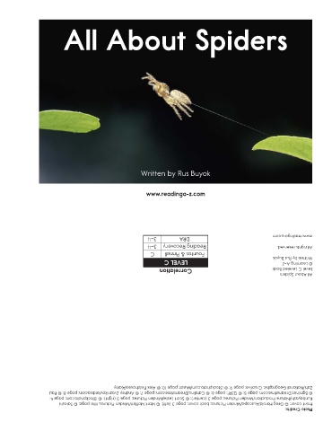 www.readinga-z.com Fountas & Pinnell Reading Recovery www.readinga-z.com All rights reserved. Written by Rus Buyok © Learning A–Z Level C Leveled Book All About Spiders Zahl/National Geographic Creative; page 9: © iStockphoto.com/Musat; page 10: © Alex Fieldhouse/Alamy © Bgminer/Dreamstime.com; page 5: © 123RF; page 6: © Catalinc/Dreamstime.com; page 7: © Andrey Zvoznikov/ardea.com; page 8: © Paul Kuribayashi/Natu