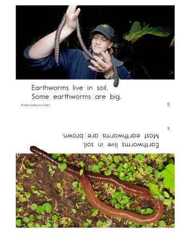 Earthworms live in soil. Some earthworms are big. All About Earthworms • Level C Most earthworms are brown. Earthworms live in soil. 5 6