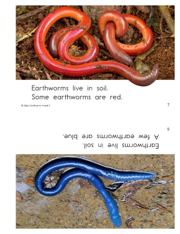 Earthworms live in soil. Some earthworms are red. All About Earthworms • Level C A few earthworms are blue. Earthworms live in soil. 7 8