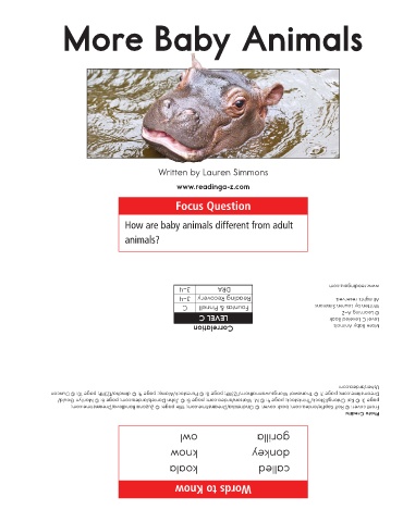 animals? C 3–4 3–4 owl know koala LEVEL C DRA Correlation Fountas & Pinnell Reading Recovery Words to Know gorilla donkey called www.readinga-z.com All rights reserved. Written by Lauren Simmons © Learning A–Z Level C Leveled Book More Baby Animals Usher/ardea.com Dreamstime.com; page 7: © Thanawat Wongsuwannathorn/123RF; page 8: © Purestock/Alamy; page 9: © dimcha/123RF; page 10: © Duncan page 3: © Kai Chiang/i