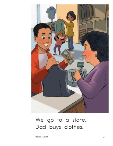 We go to a store. We go to a store. Dad buys clothes. I buy toys. We Buy • Level C 5 6