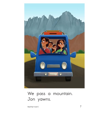 We pass a mountain. We pass a city. Jon yawns. Jon yawns. Road Trip • Level C 7 8