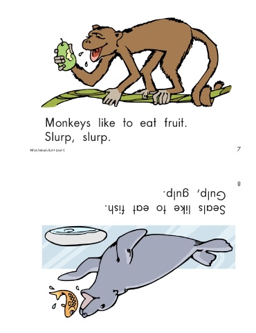 Monkeys like to eat fruit. Slurp, slurp. 7 What Animals Eat • Level C Gulp, gulp. Seals like to eat fish. 8