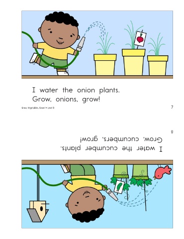 I water the onion plants. Grow, onions, grow! Grow, Vegetables, Grow! • Level D Grow, cucumbers, grow! I water the cucumber plants. 7 8