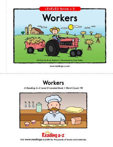 LEVELED BOOK • D Workers Written by Brian Roberts • Illustrated by Fred Volke www.readinga-z.com Workers A Reading A–Z Level D Leveled Book • Word Count: 90 Visit www.readinga-z.com for thousands of books and materials.