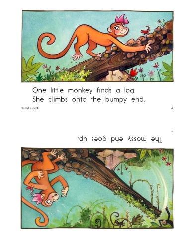 One little monkey finds a log. She climbs onto the bumpy end. Sky High • Level D The mossy end goes up. 3 4