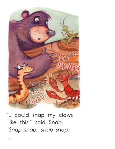 “A band!” “I could snap my claws Gabby Grasshopper said. like this,” said Snap. “What can we play?” Snap-snap, snap-snap. Swamp Music • Level D 5 6