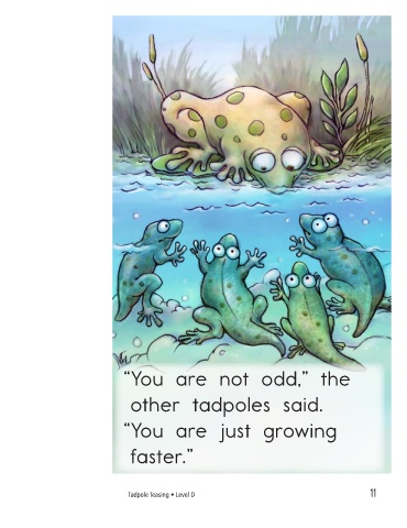 “You are not odd,” the “We are excited,” the other tadpoles said. other tadpoles said. “You are just growing “We will be frogs like faster.” you soon.” Tadpole Teasing • Level D 11 12