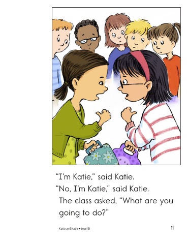 “I’m Katie,” said Katie. “I’ll be Kate!” said Kate. “No, I’m Katie,” said Katie. “I’ll be Kat!” said Kat. The class asked, “What are you “That’s a great idea!” going to do?” the class said. Katie and Katie • Level D 11 12