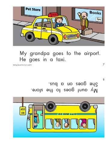 My grandpa goes to the airport. He goes in a taxi. 7 Getting Around the City • Level D She goes on a bus. My aunt goes to the store. 8
