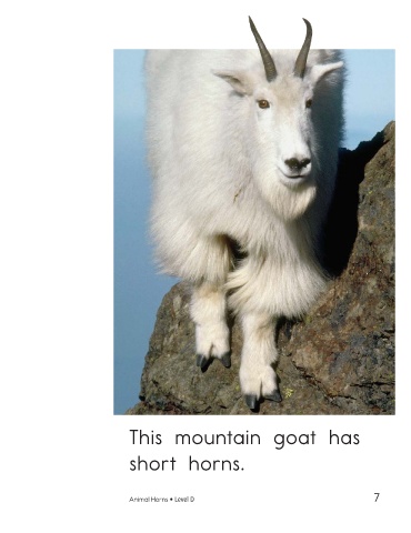 This mountain goat has This antelope has short horns. straight horns. Animal Horns • Level D 7 8