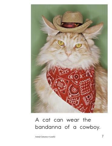 A cat can wear the A dog can wear the bandanna of a cowboy. mask of a superhero. Animal Costumes • Level D 7 8