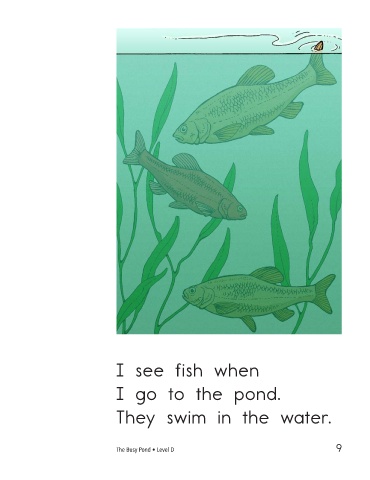 I see many things when I see fish when I go to the pond. I go to the pond. The pond is a busy They swim in the water. place. The Busy Pond • Level D 9 10