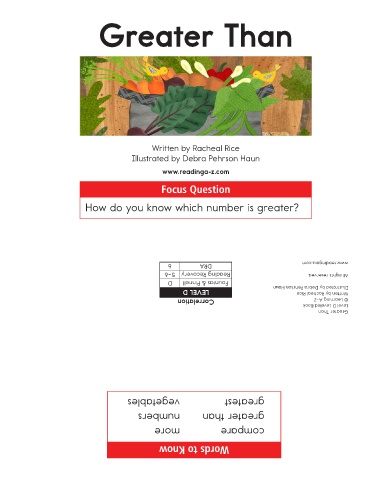 How do you know which number is greater? www.readinga-z.com All rights reserved. Illustrated by Debra Pehrson Haun Written by Racheal Rice © Learning A–Z Level D Leveled Book Greater Than