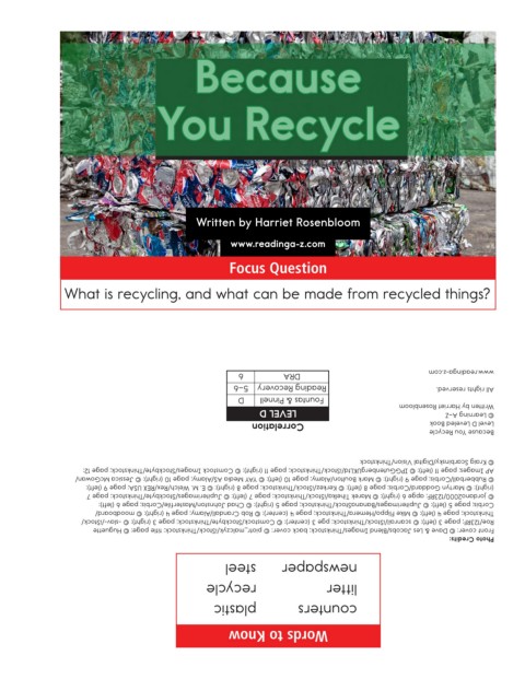 What is recycling, and what can be made from recycled things? www.readinga-z.com All rights reserved. Written by Harriet Rosenbloom © Learning A–Z Level D Leveled Book Because You Recycle © Kraig Scarbinsky/Digital Vision/Thinkstock AP Images; page 11 (left): © IPGGutenbergUKLtd/iStock/Thinkstock; page 11 (right): © Comstock Images/Stockbyte/Thinkstock; page 12: © Rubberball/Corbis; page 9 (right): © Mark Boulton/Alamy;
