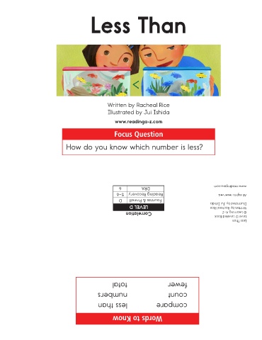 How do you know which number is less? www.readinga-z.com All rights reserved. Illustrated by Jui Ishida Written by Racheal Rice © Learning A–Z Level D Leveled Book Less Than