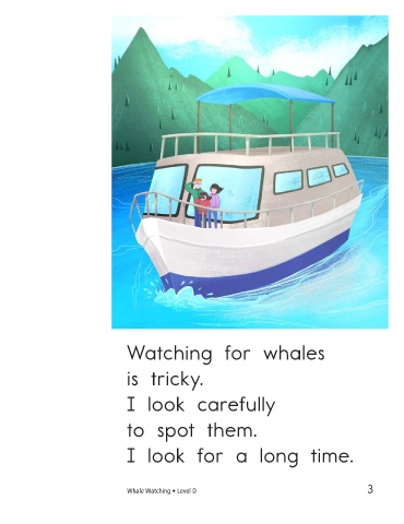 Watching for whales is tricky. I look carefully I watch for whales to spot them. near the boat. I look for a long time. No luck. Whale Watching • Level D 3 4