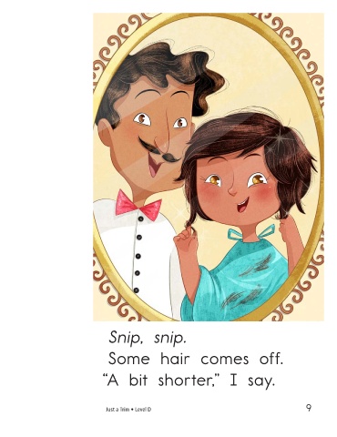 Snip, snip. Snip, snip. Some hair comes off. All done. “A bit shorter,” I say. My short hair is fun! Just a Trim • Level D 9 10