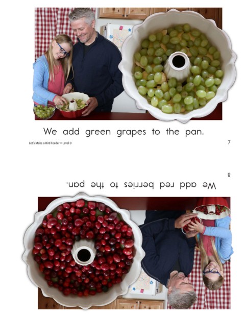We add green grapes to the pan. Let’s Make a Bird Feeder • Level D We add red berries to the pan. 7 8