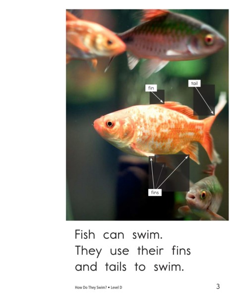 tail fin fins feet Fish can swim. Ducks can swim. They use their fins They use their feet and tails to swim. to swim. How Do They Swim? • Level D 3 4
