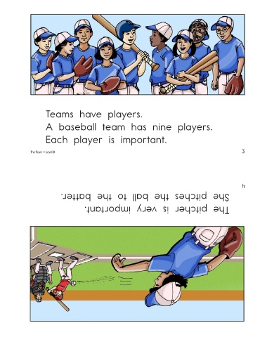 Teams have players. A baseball team has nine players. Each player is important. The Team • Level D She pitches the ball to the batter. The pitcher is very important. 3 4