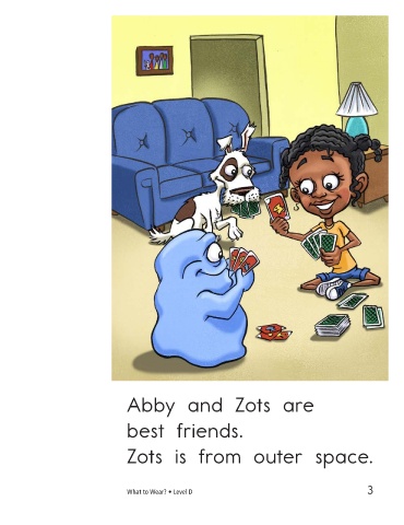 “You need some clothes,” Abby and Zots are Abby tells Zots. best friends. Abby and Zots go Zots is from outer space. to the closet. What to Wear? • Level D 3 4