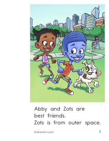 Abby and Zots are best friends. Zots is from outer space. Zots is hungry. Do Not Eat That! • Level D 3 4