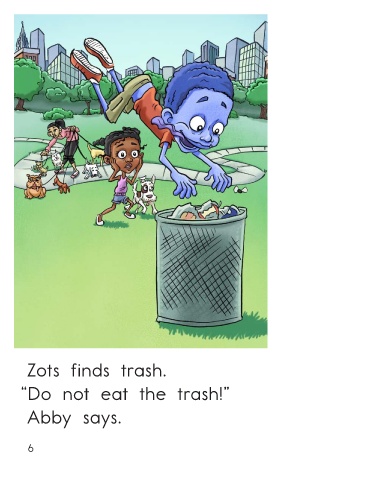 Zots finds puppies. Zots finds trash. “Do not eat the puppies!” “Do not eat the trash!” Abby says. Abby says. Do Not Eat That! • Level D 5 6