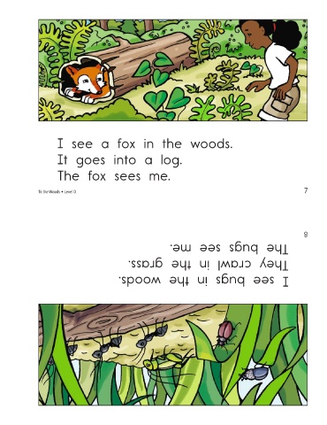 I see a fox in the woods. It goes into a log. The fox sees me. To the Woods • Level D The bugs see me. They crawl in the grass. I see bugs in the woods. 7 8
