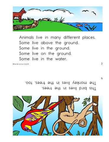 Animals live in many different places. Some live above the ground. Some live in the ground. Some live on the ground. Some live in the water. 3 Where Animals Live • Level D The monkey lives in the trees, too. This bird lives in the trees. 4