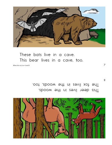 These bats live in a cave. This bear lives in a cave, too. 7 Where Animals Live • Level D The fox lives in the woods, too. This deer lives in the woods. 8