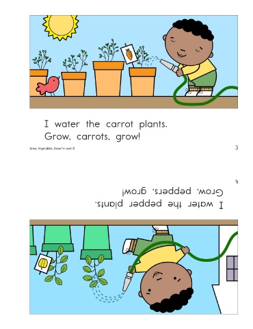 I water the carrot plants. Grow, carrots, grow! Grow, Vegetables, Grow! • Level D Grow, peppers, grow! I water the pepper plants. 3 4